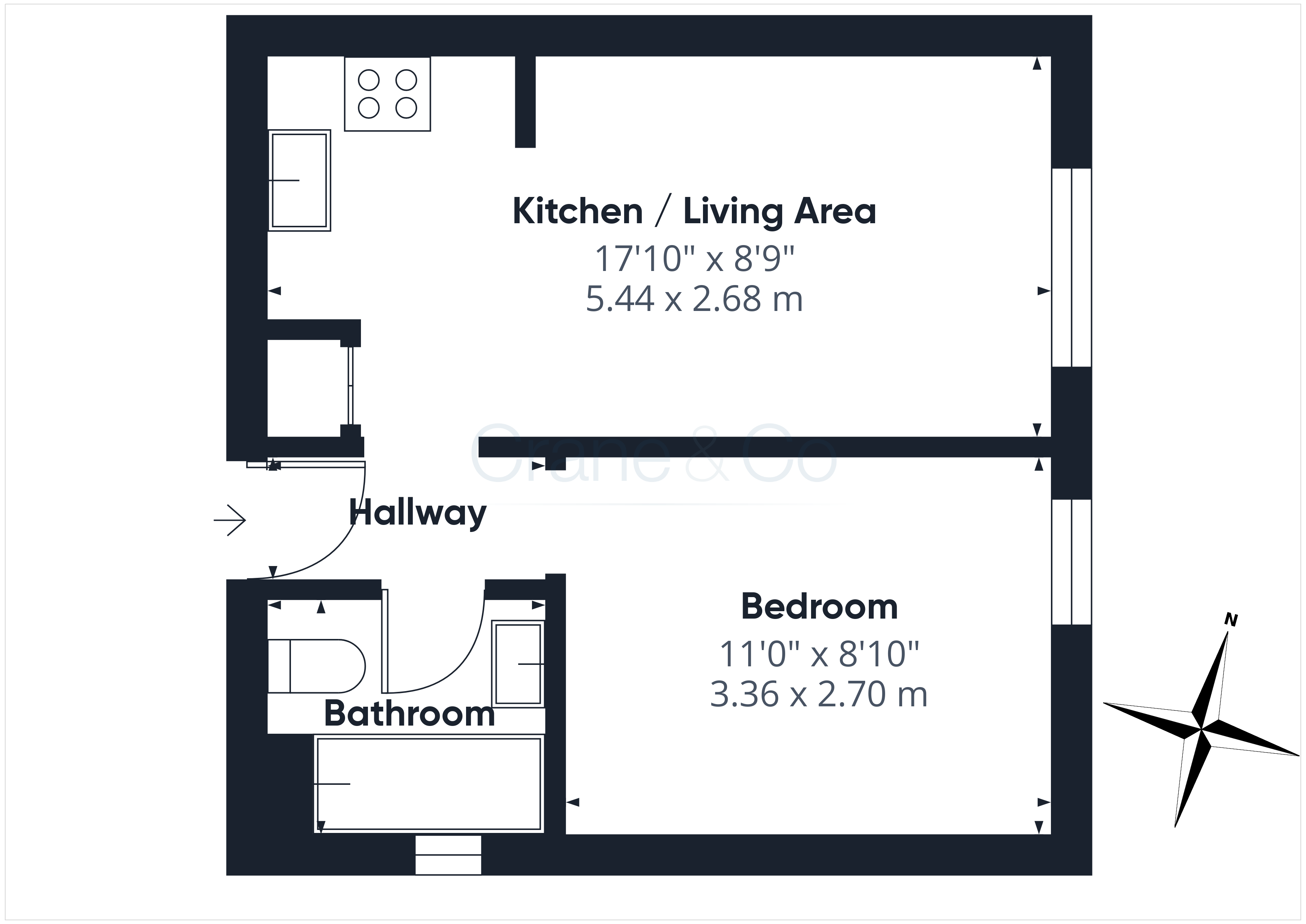 - Kitchen/Living Area - 17' 10" x 8' 9" : (17' 10" x 8' 9" (5.44m x 2.67m) )
